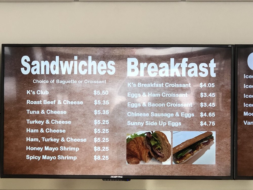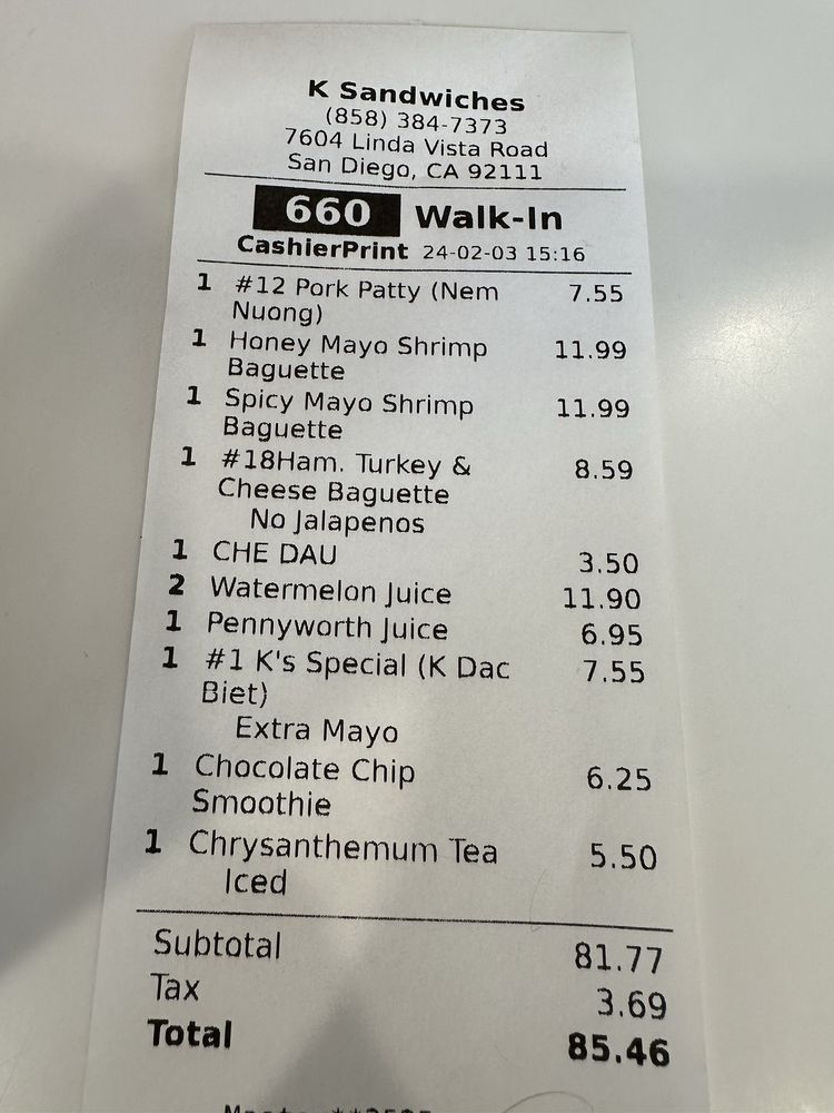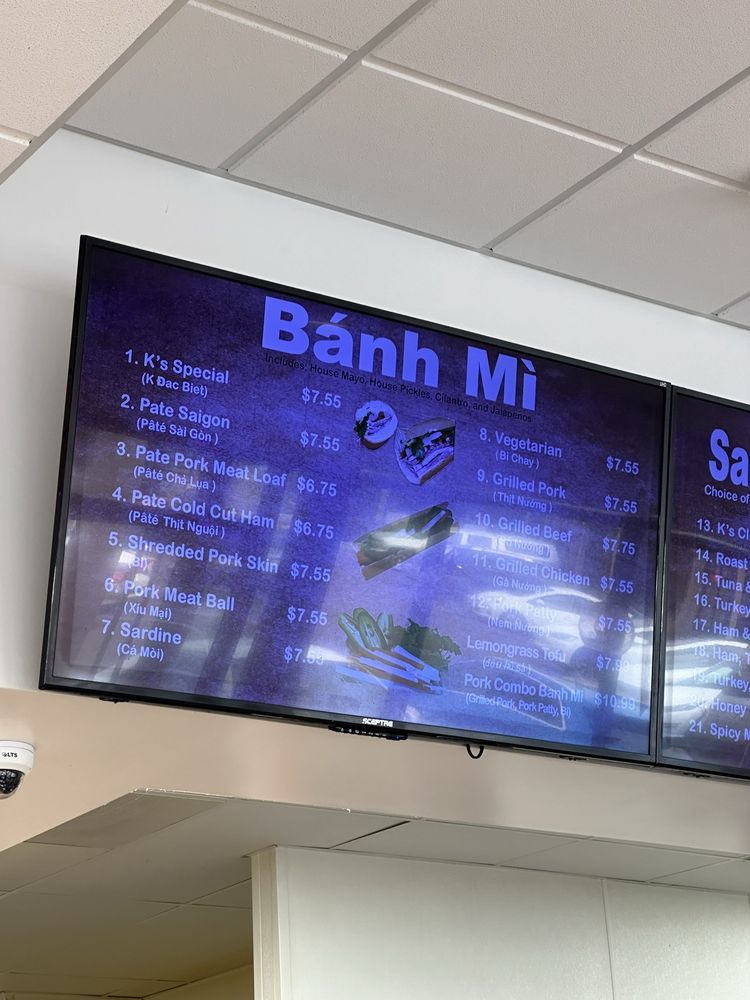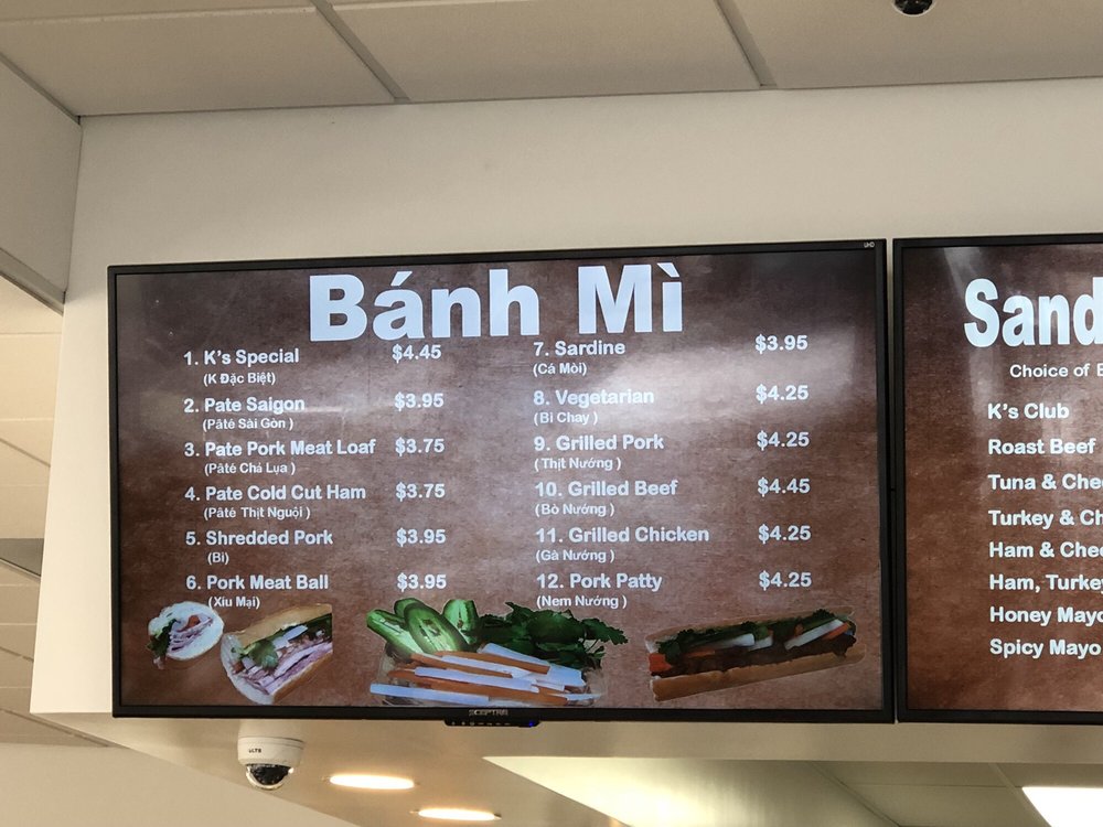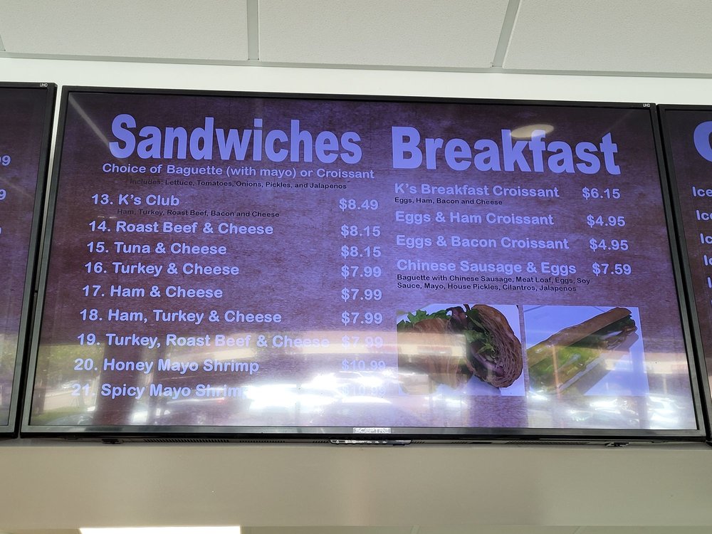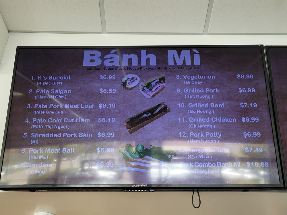 Introducing the menu at K Sandwiches, a Vietnamese bakery and sandwich shop in San Diego, CA. This casual yet classy spot offers an array of options, including Banh Mis, Banh Baos, PatĂȘchaud, eggrolls, and more. Customers rave about the fresh ingredients, affordable prices, and delicious grilled pork sandwiches (#9 Grilled Pork). The menu also features Vietnamese desserts, drinks, and daily specials like curry. The ambiance is welcoming, with ample seating and a quick service. Whether you're looking for a quick lunch on the go or a catered event for a group, K Sandwiches has something for everyone. Don't miss out on their avocado shakes and sesame balls! Enjoy a taste of Vietnam in Southern California at K Sandwiches.
